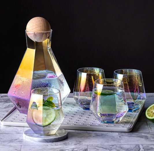 Over the Rainbow 5-Piece Iridescent Glass Decanter Set | 44oz Decanter with Wooden Round Lid | 4- 12oz drinking glasses