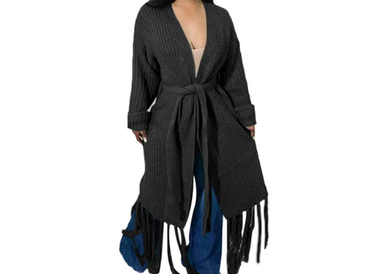 Long Open Front Cozy Fall/Winter Knitted Belt Bottom Tassels Vibrant Color Tall Plus Sized Maxi Cardigan Sweater