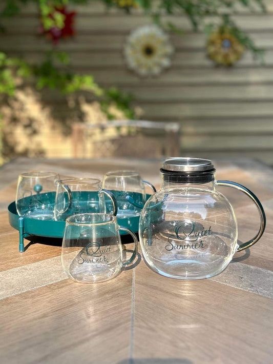 Metallic Rimmed 'Quiet Summer' 8-Piece Glass and Metal Tea Set | Metal Lid and Metal Serving Tray