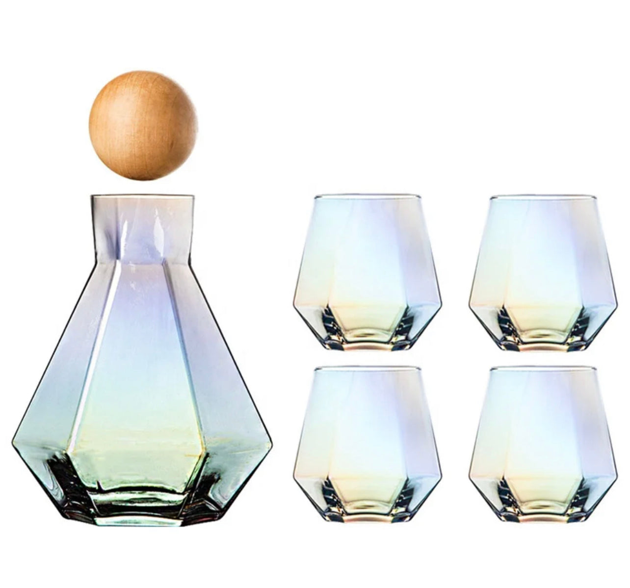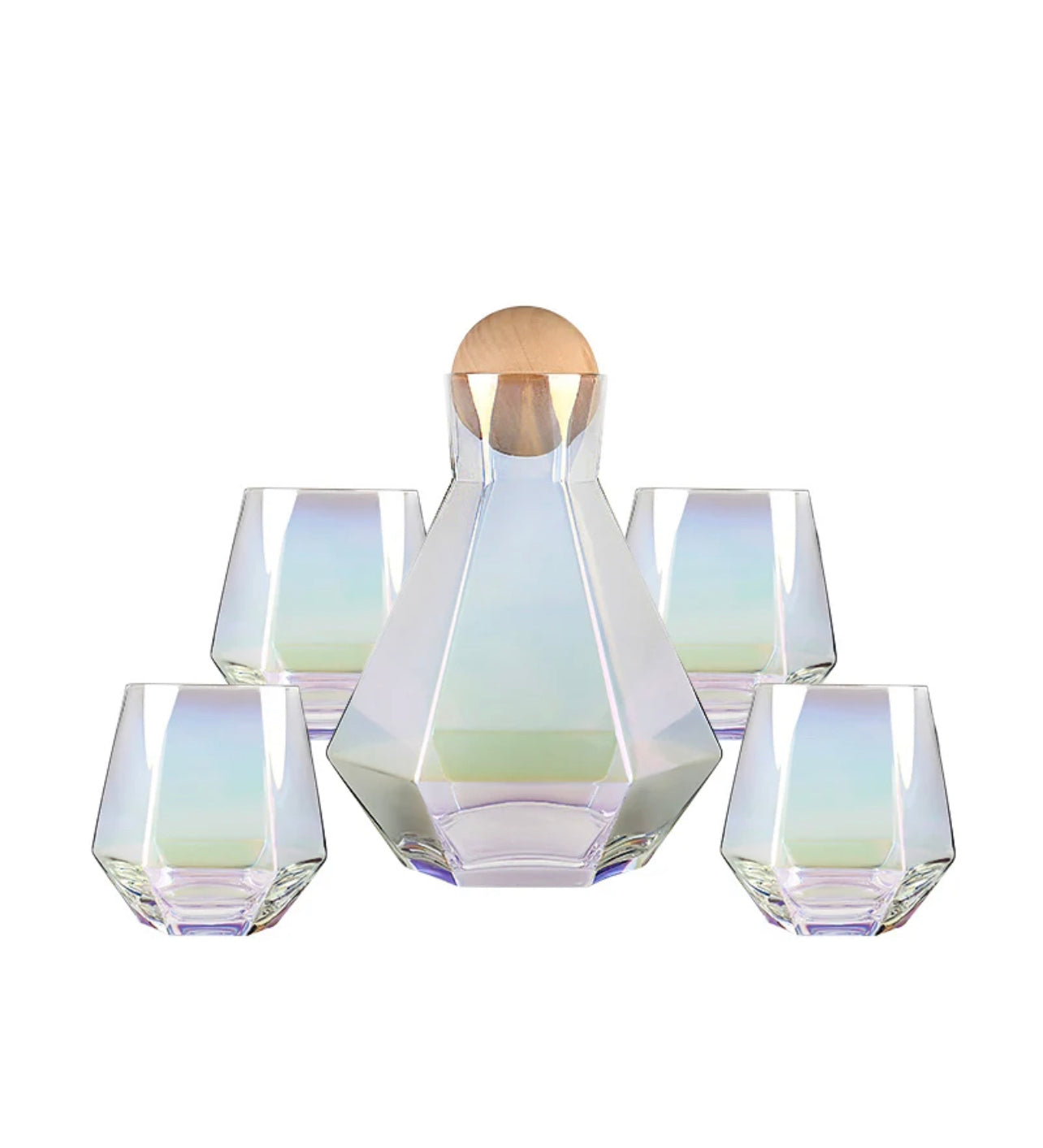 Over the Rainbow 5-Piece Iridescent Glass Decanter Set | 44oz Decanter with Wooden Round Lid | 4- 12oz drinking glasses