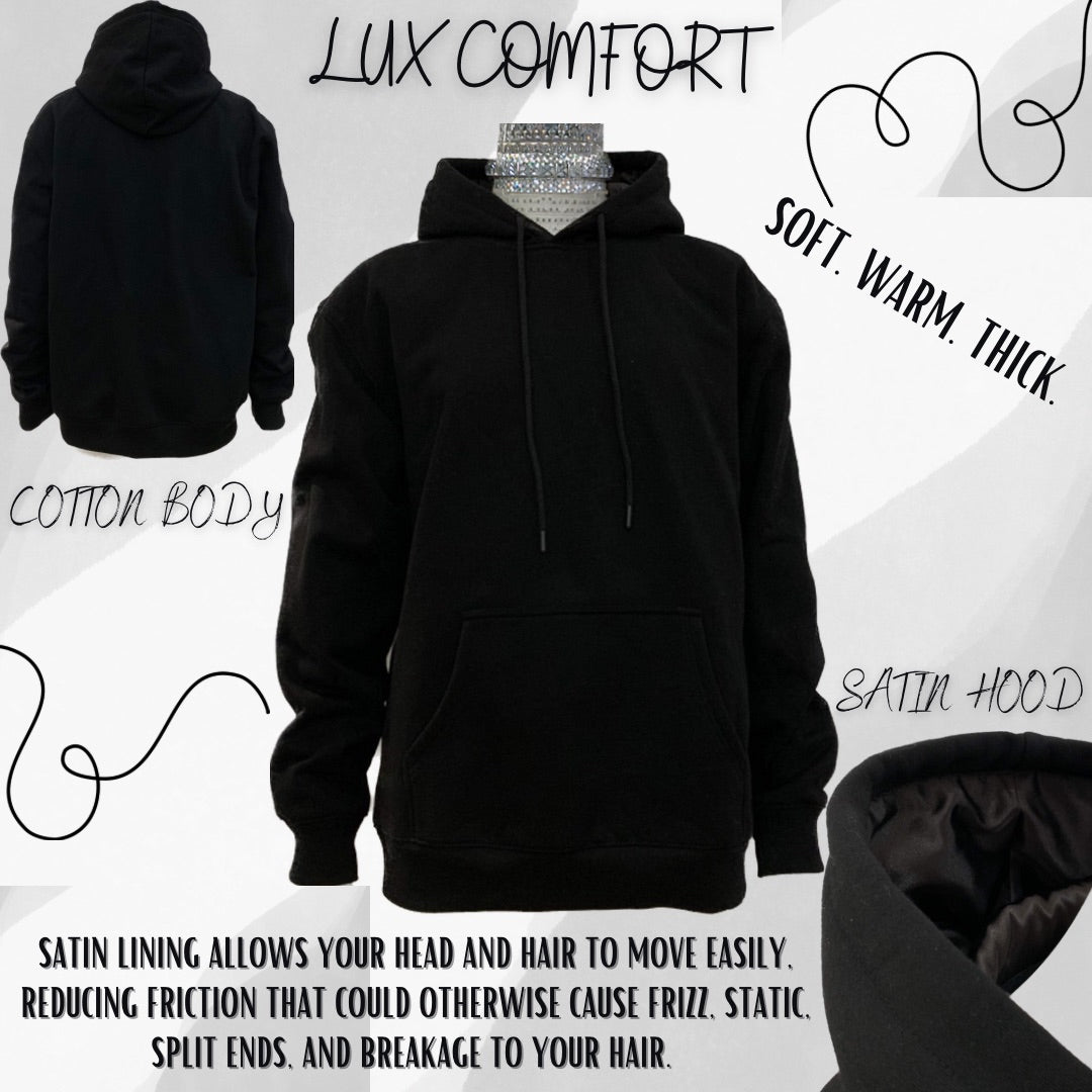 The body of this pullover embodies lux comfort; it’s soft, warm, and thick. The glossy smooth textured weaving of the hoodies’ satin lining allows your head and hair to move easily, reducing friction that could otherwise cause frizz, static, split ends, and breakage to your hair. The satin is also less absorbent, which helps prevent the escaping of your hair's nutrients via your hood, leaving your hair hydrated and happy.